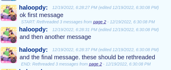 rethreadobject in the values, that looks like:originalContentIdwhich never changes, even if the message gets rethreaded over and overrethreadvalue is updated for the start and end messages anytime a rethread occurs, butoriginalContentIdis stamped once and thus will always tell you the original room a message was posted inI've added code to your frontend in this pull request which will render the same annotation as my frontend, just a simple div with some links (but reformatted for your link format). However, I did NOT actually display it anywhere, instead I log it, because I don't know what you want to do with it. It IS part of a "message-part", but it seems difficult to insert anywhere. Maybe as its own element between message parts? I feel like that might break stuff, so I wanted to leave that up to you. Also, feel free to change the formatting or completely rewrite the