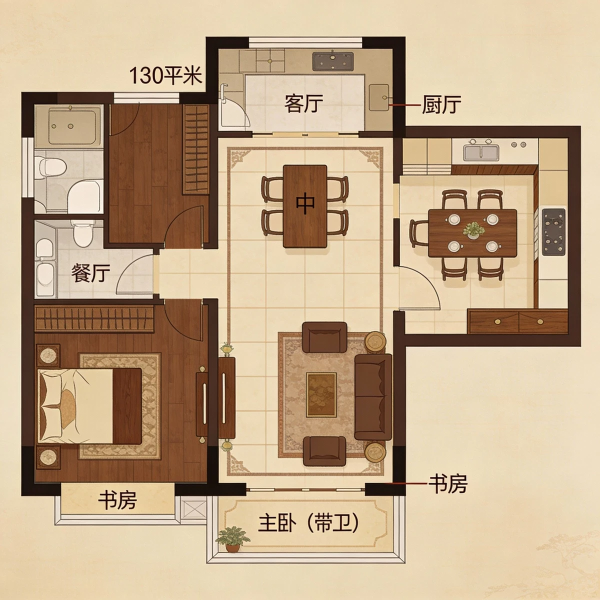 - 撰写详细描述:例如:“一套 120平米的三居室平面图,现代风格,南北通透,主卧带独立卫浴,开放式厨房连接餐厅。”