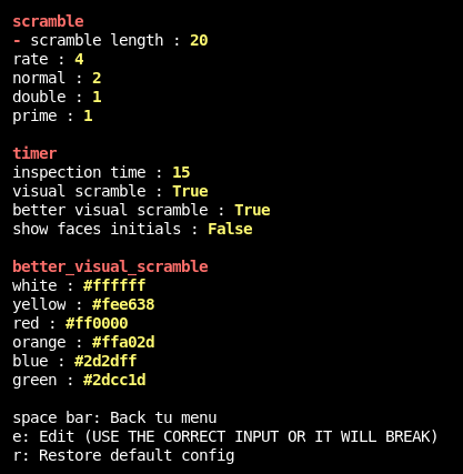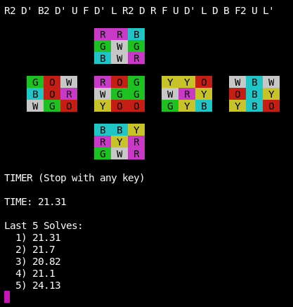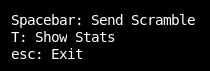 You can STOP the Timer with any key but you can only starts it with the space bar. When You finish your solve, terminal will shows your last 5 solves. Then press Spacebar to back to menu.