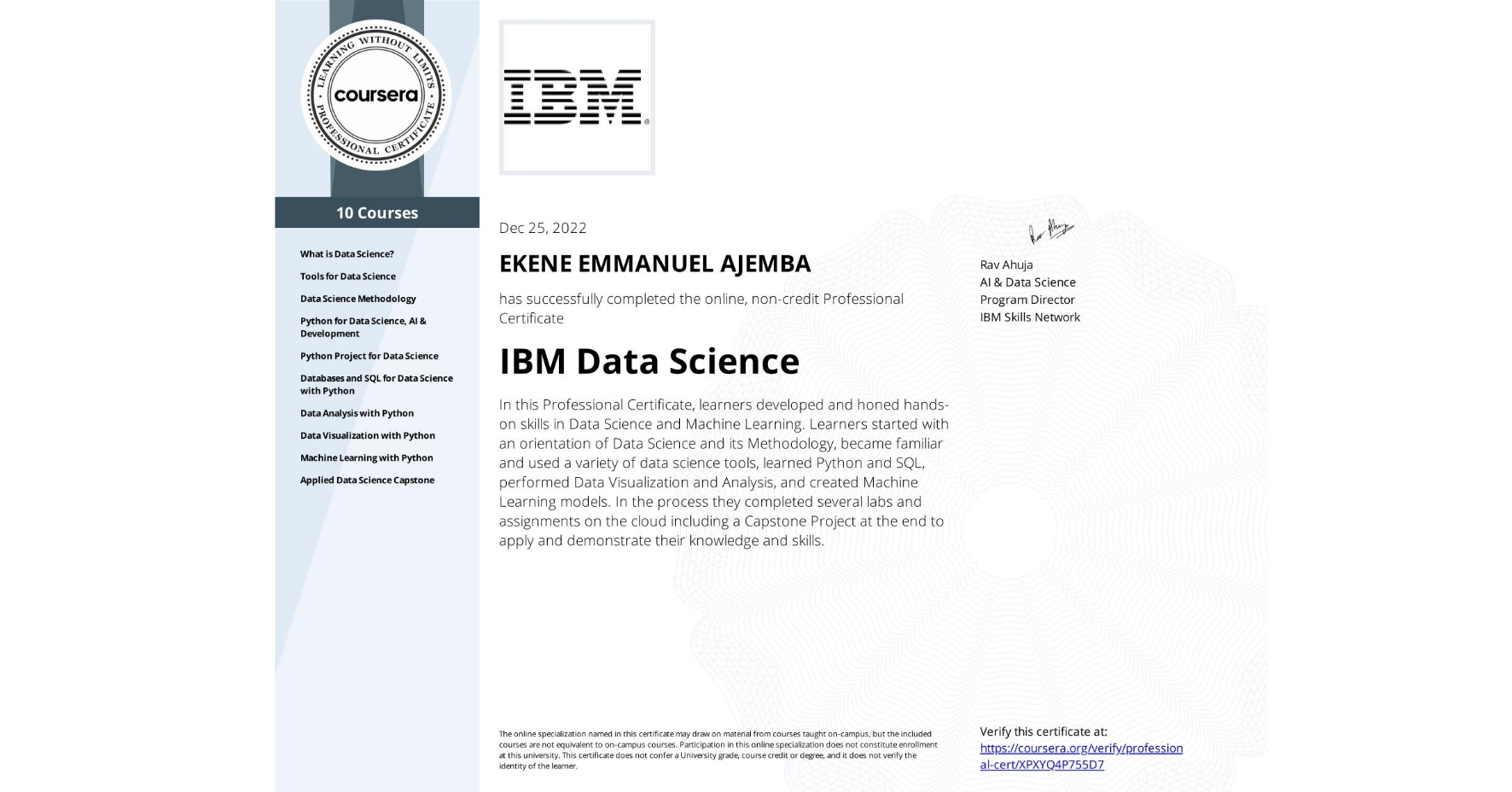 The following Python libraries were used throughout the certification: