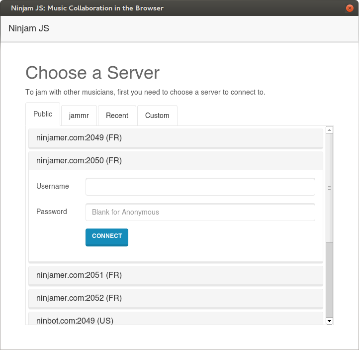 Ninjam JS is built using web technologies (JavaScript, HTML, CSS) and acts as a NINJAM client, connecting to servers just like the official C++ client. It can run as a standalone application using Electron, as a Chrome App, or (almost) as a packaged app for Firefox OS.