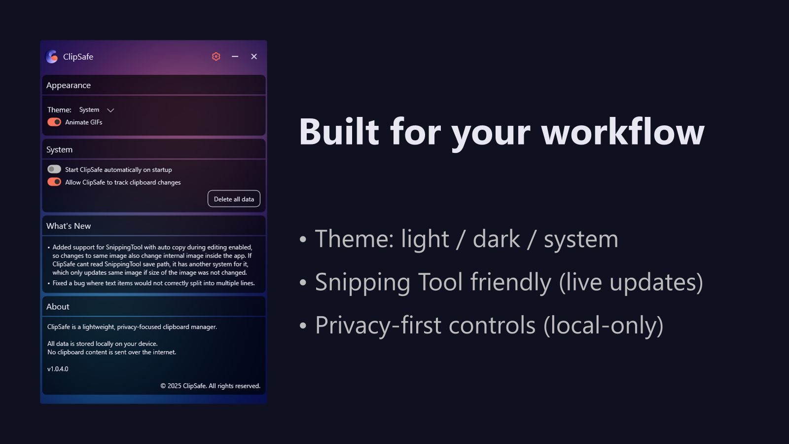 ClipSafe is a privacy-first clipboard manager for Windows. It keeps your entire clipboard history saved locally and searchable, so your data stays private.