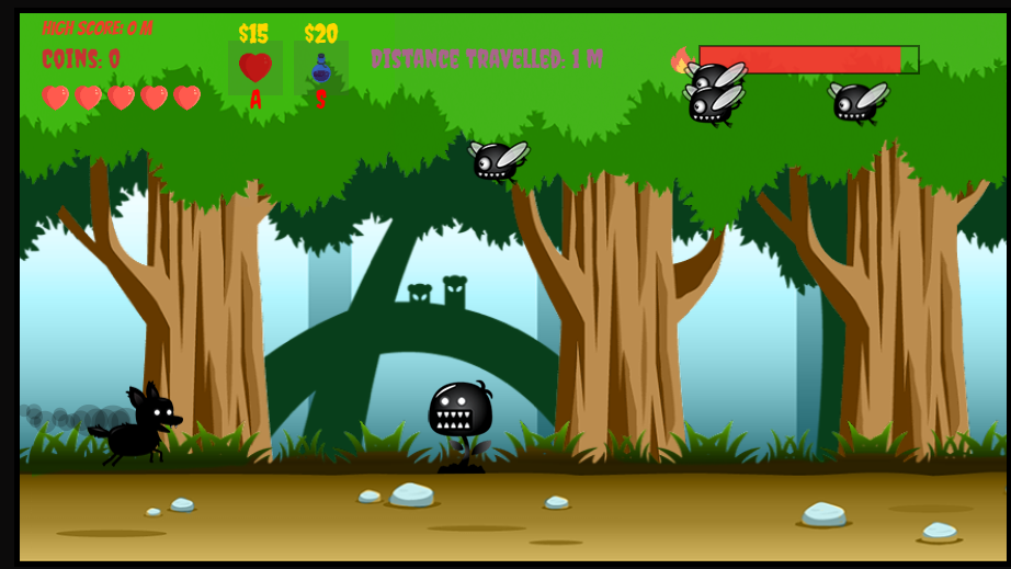 Champion Fido is a simple and easy-to-play game. The objective of the game is to hunt down flying and ground enemies while traveling as far as possible. The player can only hunt the enemies when they are rolling. If the player touches an enemy while rolling, the enemy dies. However, if the player is not rolling, the player's life decreases by one. To increase life or boost the player, the player must get an item on the way or buy the item using the available coins.