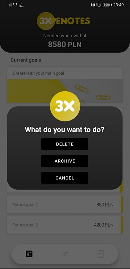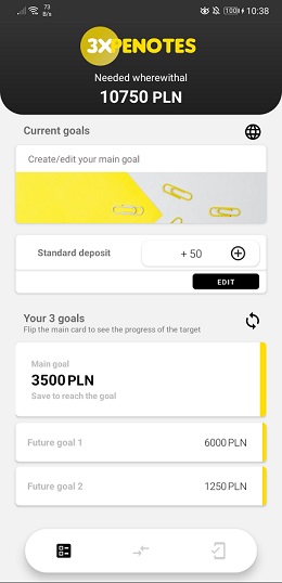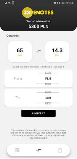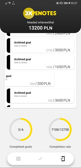 "ExpeNotes" app is a type of expense notebook that allows you to set three main goals and focus on one of them (the main one). The application allows you to easily track the status of achieving our goals, but the card showing the main goal by default hides the state of current savings, all in order to surprise you with a message about the goal achieved. A possible flip card allows you to preview your current target. Archived goals are placed on the list of archived goals, and on this basis, a list of statistics of our commitment to achieving goals is created.The functionalities of the application are complemented by a currency converter that takes the current rate from the open api and presents us with the converted amount in a simple way.
