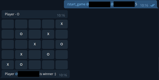 TicTacToeTelegramBot Telegram bot for playing tic tac toe game Commands /startPvP @userTag @userTag2 size(it is in range from 3 to 10) Example: /startPvP @Player1 @Player2 3