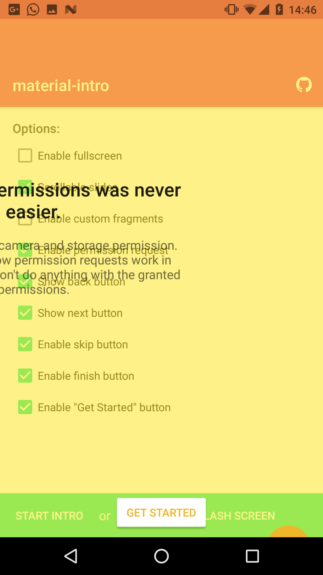 material-intro has fluent style builders for both a simple text/image slide, as seen in Google's apps, and for slides featuring a custom Fragment or layout resource.