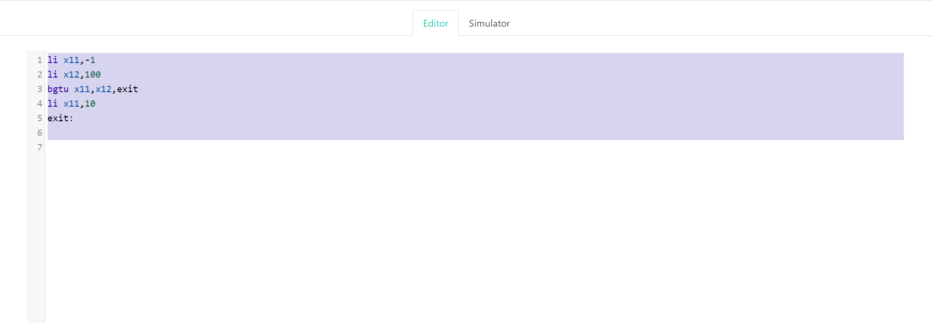 li x11,-1 li x12,100 bgtu x11,x12,exit li x11,10 exit: