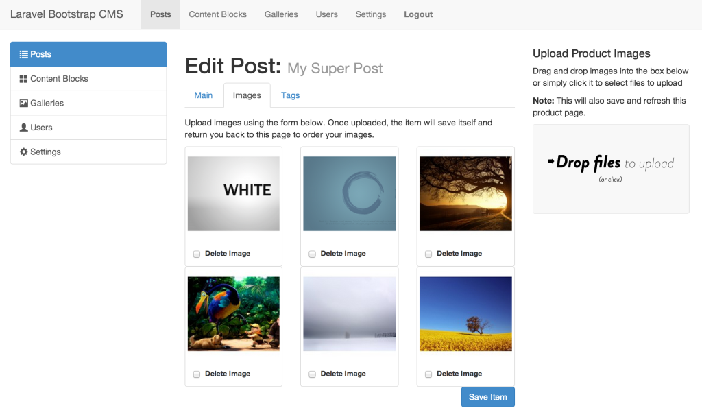A Laravel 4.1 PHP 5.4 CMS using Bootstrap 3. Laravel Bootstrap does not handle the front-end of your site. It merely provides a CRUD framework with some predefined systems (image gallery, pages etc) for you to enter and edit your data with.