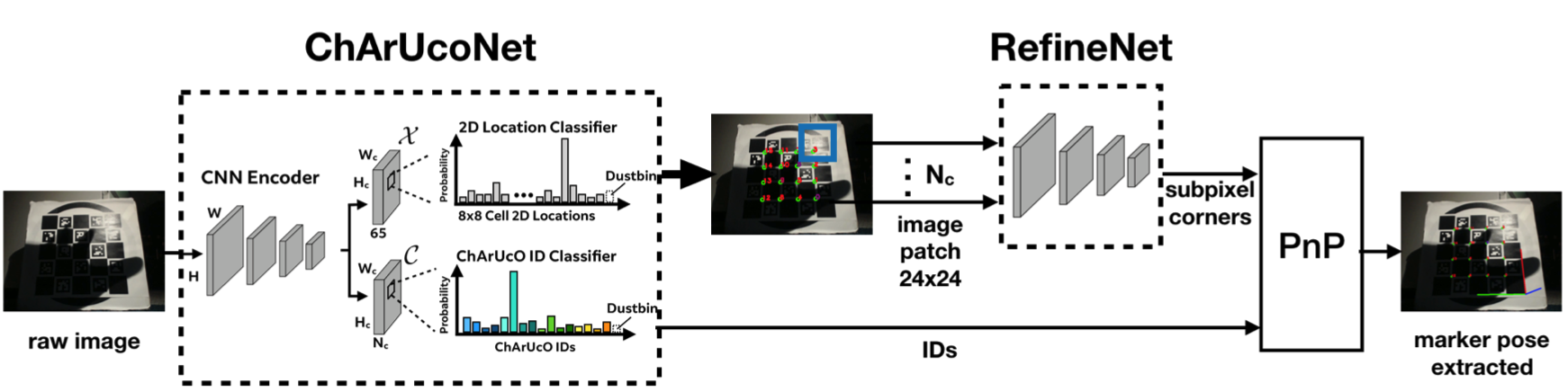 Unofficial pytorch (lightning) implementation of the model proposed by Hu et al. in their paper Deep ChArUco: Dark ChArUco Marker Pose Estimation CVPR2019 for ChArUco board localization. This is a personal project and I have no affiliation with the authors, the results obtained might differ and should not be considered a reference of the paper results. All the data used by the paper is not public and therefore a fair comparison is impossible.