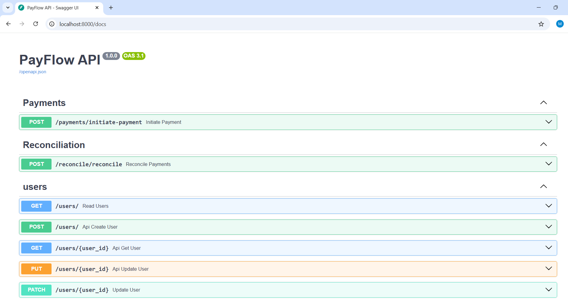 PayFlow is a backend payment system API built with Python (FastAPI) and PostgreSQL, designed for: