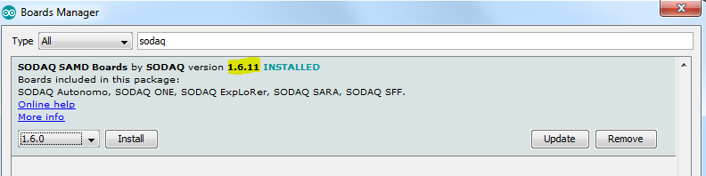 Before programming the source code to the SAMD21 on Sodaq Board, ensure in board manager that the version 1.6.11 is installed for board package support for Sodaq Xplorer Boards.