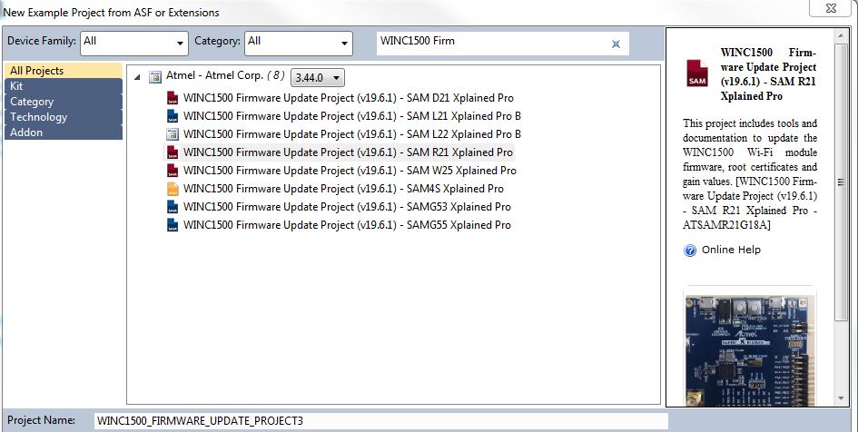 - Open Atmel Studio, new example project and WINC1500_FIRMWARE_UPDATE as shown in figure