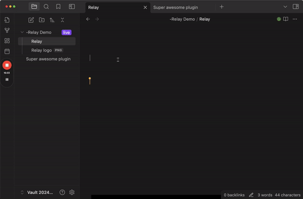 Relay is a collaborative editing plugin for Obsidian by System 3. It uses CRDTs to enable snappy, local-first, real-time and asynchronous collaboration.