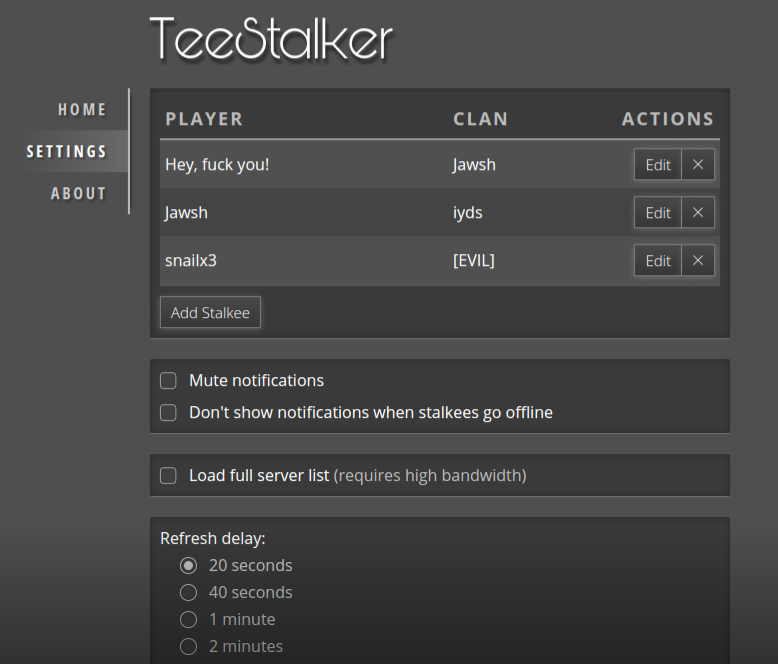- This project is no longer being maintained.Receive browser notifications for every move your Teeworlds stalkees make (joining/leaving/changing Teeworlds Servers).