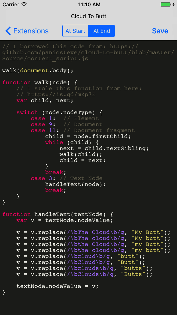 The code editor for the extensions has syntax highlighting and auto indentation. So that's pretty neat.