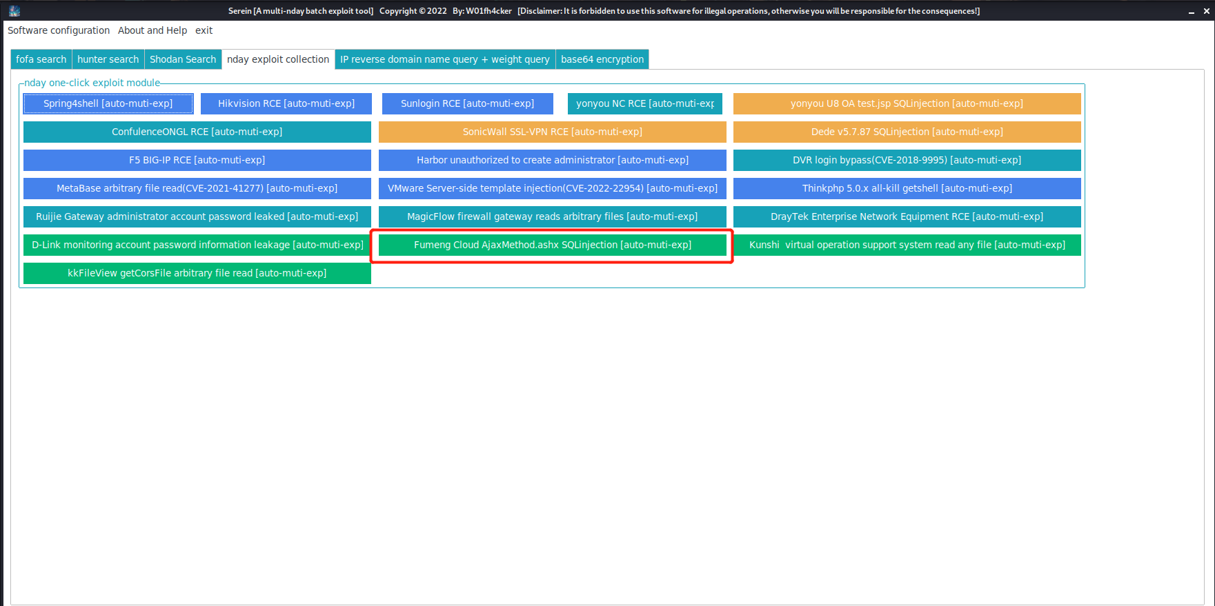 Software Configurationin the upper left corner to configureemailandkeyoffofa(note that it is not a password, butAPI KEYinhttps://fofa.info/personalData), then you can be happy to usefofa searchinstead. **Note: It must be afofaordinary/advanced/enterprise account, becausefofaregistered members need to consumefcoins to callapi, if you are a registered member, please make sure you havefcoins, otherwise you cannot query ! ** -