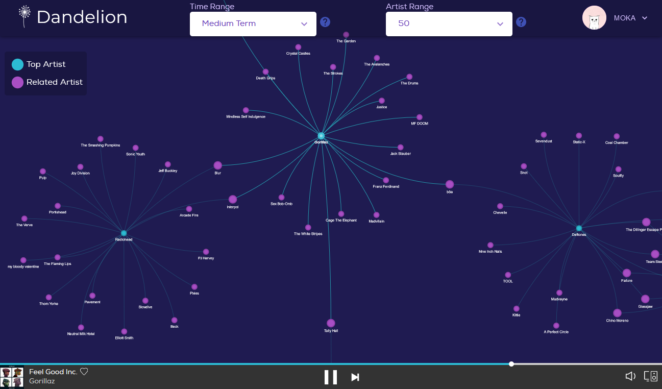 Dandelion is a visualization tool that plots the relationships between the user's preferred artists from Spotify. This paints a picture of their general listening pattern. It offers insight into potential new artists the user might also enjoy. This app is fully interactive and utilizes open source tools to offer a unique and fun web experience!