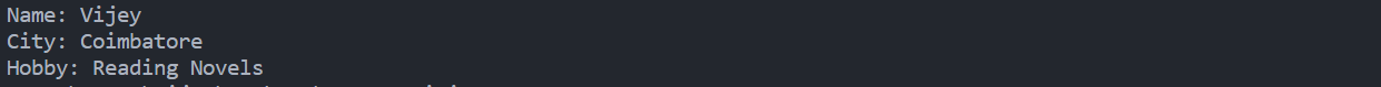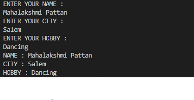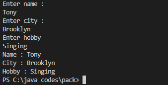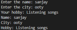 System.out.println("name is :"+Name+"city is: "+City+"hobby is: "+Hobby);