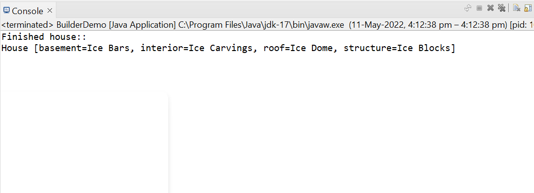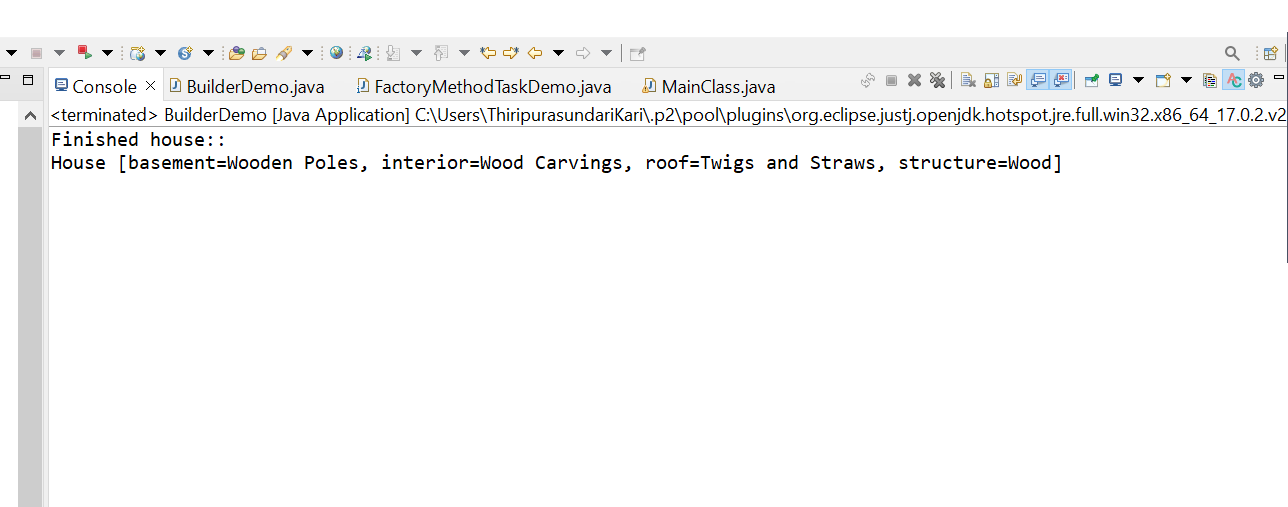 HouseBuilderby the client. The client should only interact with theCivilEngineerand provide the desired house to theCivilEngineerin the form of aStringvalue.You can refer to the Factory Method pattern demo code here. And, you can refer to this whiteboard for the illustrations and theoretical concepts of different design patterns.