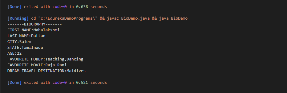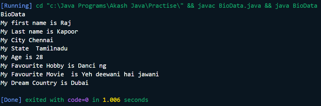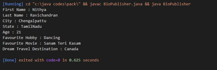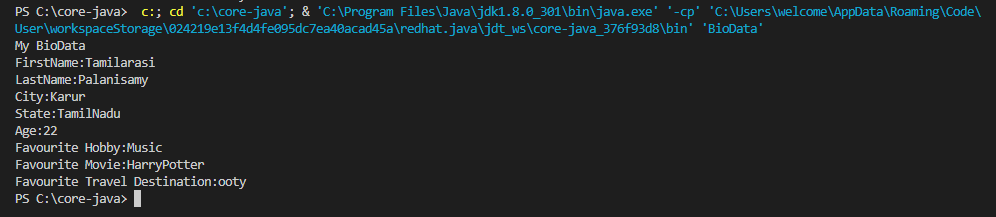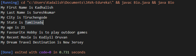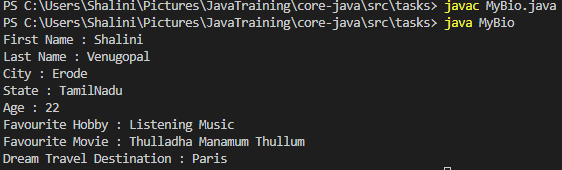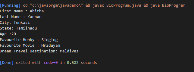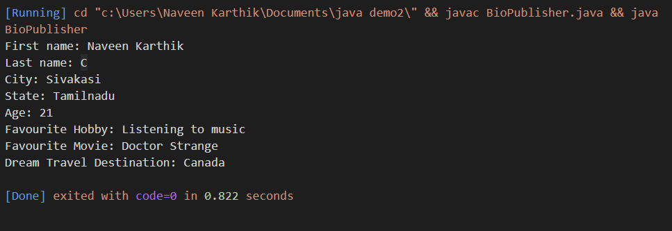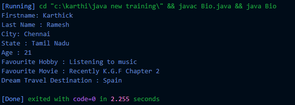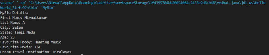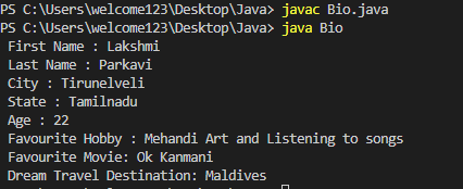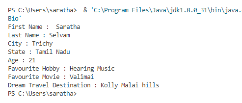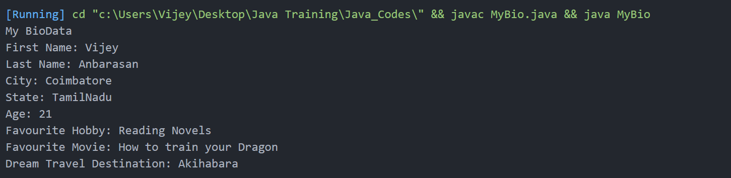 System.out.println("\nFirst Name: Vijey\nLast Name: Anbarasan\nCity: Coimbatore\nState: TamilNadu\nAge: 21\nFavourite Hobby: Reading Novels\nFavourite Movie: How to train your Dragon\nDream Travel Destination: Akihabara");