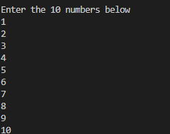 Take 10 integer inputs from the user and store them in an array and print them on screen.