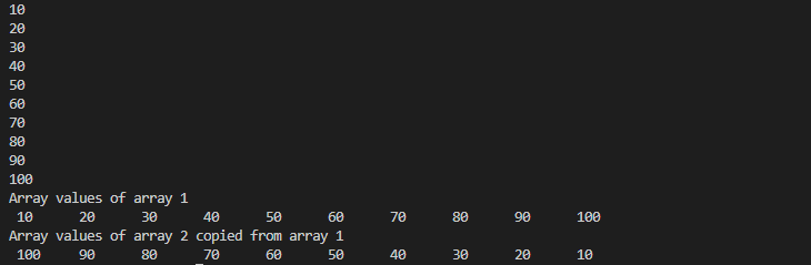 Take 10 integer inputs from user and store them in an array. Now, copy all the elements in an another array but in reverse order.