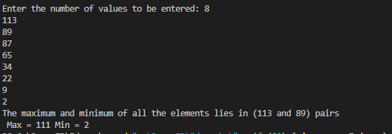 Consider an integer array, the number of elements in which is determined by the user. The elements are also taken as input from the user. Write a program to find those pair of elements that has the maximum and minimum difference among all element pairs.