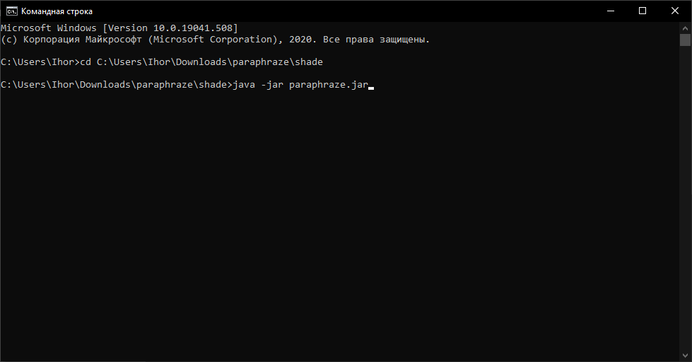 В цій папкі буде файл із розширенням .jar. Щоб його запустити треба ввести команду java -jar paraphraze.jar та програма запуститься