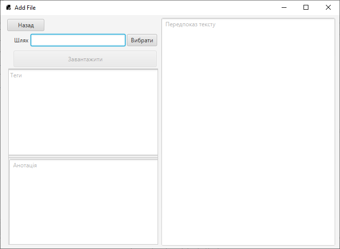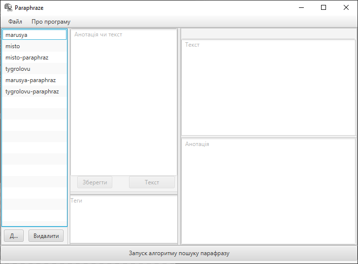 З малюнку видно, що зліва відображується список текстів у базі даних, знизу дві кнопки: Додати та Видалити