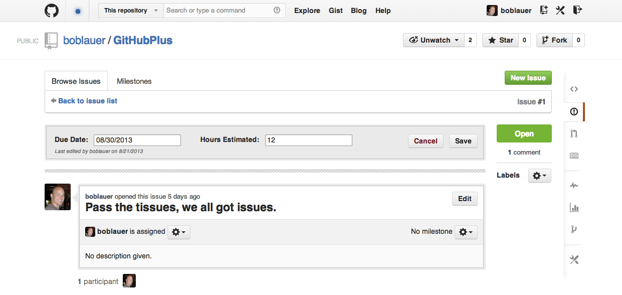 You can see that whoever built the extension provided a friendly message for you so you can quickly install the extension. But perhaps more importantly, the JSON data that is stored in the comment is fairly easy to read. This means that you can still see that important data. Even if I don't have GitHub+ installed, I can still see above that the due date is 8/30/2013. It may not be the prettiest format, but I can read it, and that's way better than nothing.