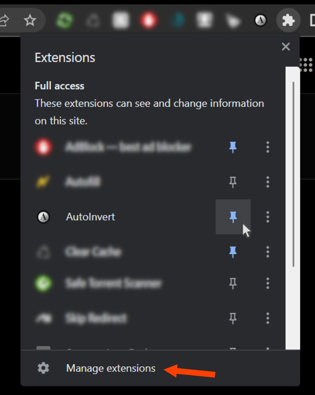 4. At this point, for showing at the top of the icon the AutoInvert toggle button you have to reclick on the puzzle icon and pin the extensions.