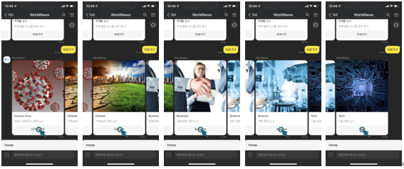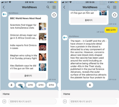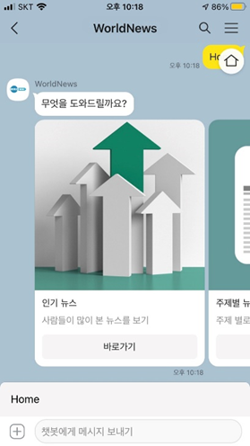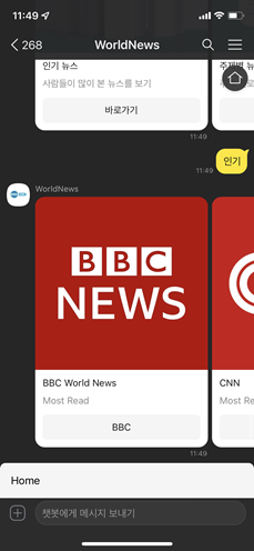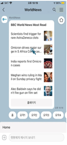 WorldNews는 해외의 여러 지역 별 대표 언론사의 인기 뉴스와 주제별 뉴스를 볼 수 있는 카카오 챗봇입니다. 사용자는 언제 어디서든 챗봇을 통해 BBC, CNN과 같은 해외 유명 언론사의 뉴스들을 제공받고 링크를 통해 직접 언론사의 웹사이트의 기사를 읽어볼 수도 있습니다. 또한 기사들에 대한 요약 기능을 통해 짧게 간추려진 기사의 내용을 받아 볼 수 있고, 사용자가 요청에 따라 요약된 기사를 번역하여 제공받을 수도 있습니다.