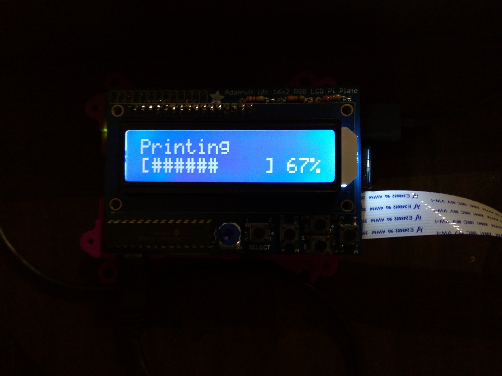 Displays printer progress while printing on a Adafruit 16x2 LCD attached to a Rasperry Pi. This makes it easy to see print progress without the need to look at OctoPrint.
