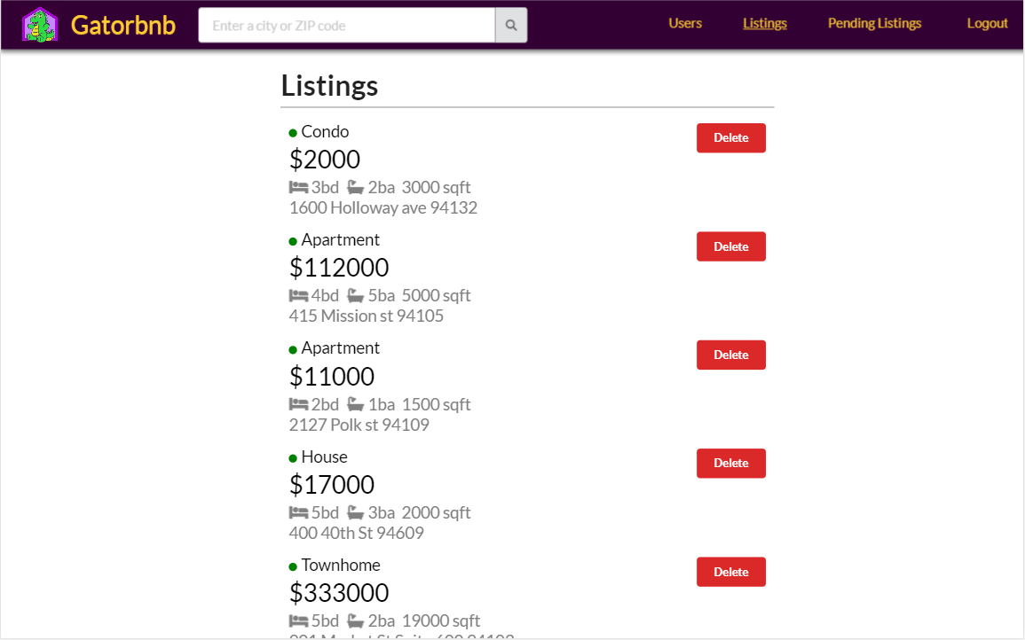 - Created pages/UI for landing page, home, filter, search, navbar, listing results, listing details, dashboard, and admin dashboard