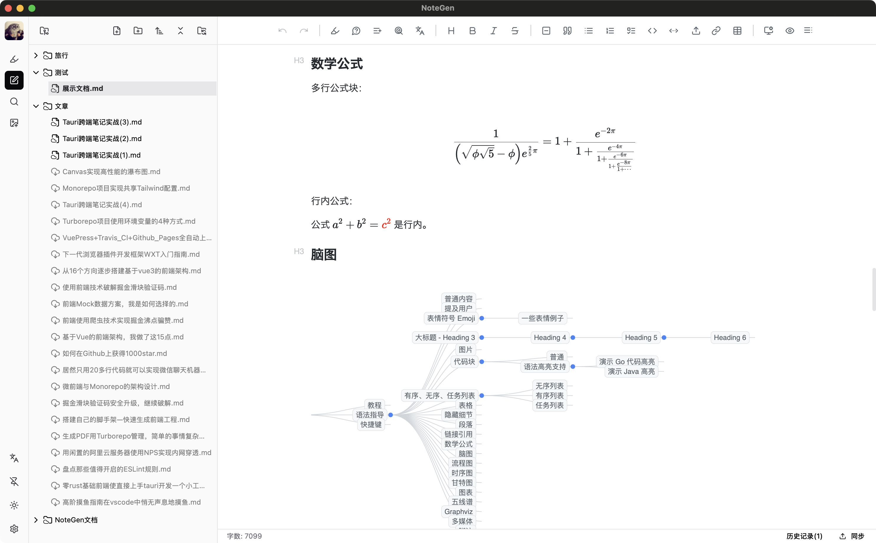- Supports outlines, math formulas, mind maps, charts, flowcharts, Gantt charts, sequence diagrams, staves, multimedia, voice reading, title anchors, code highlighting and copying, graphviz rendering, and plantuml UML diagrams.