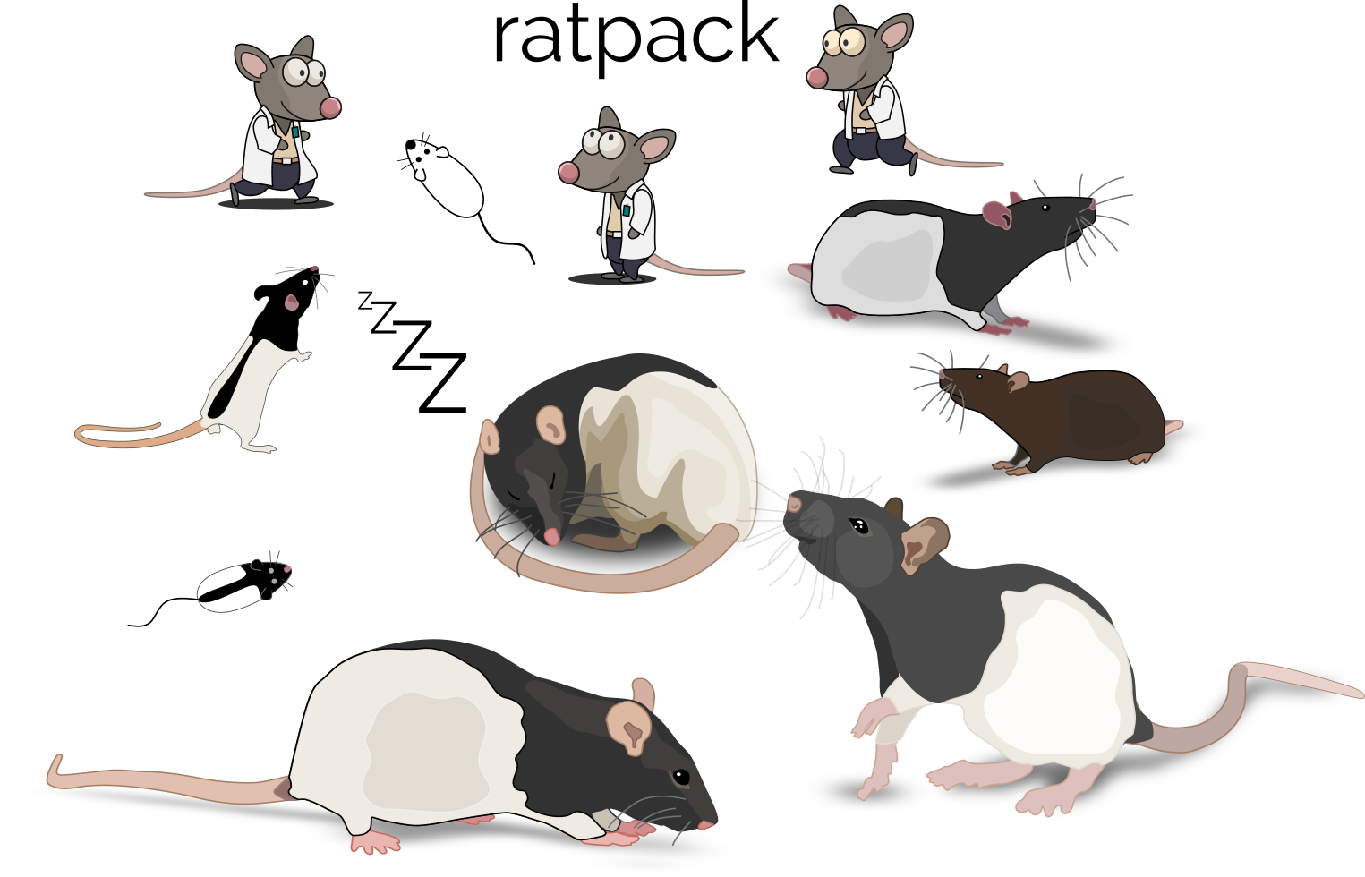 ratpack Pack of vector rats (Long Evans, mostly) for use in publications, illustrations, etc. This is a work in progress. More rats will be added as time permits.