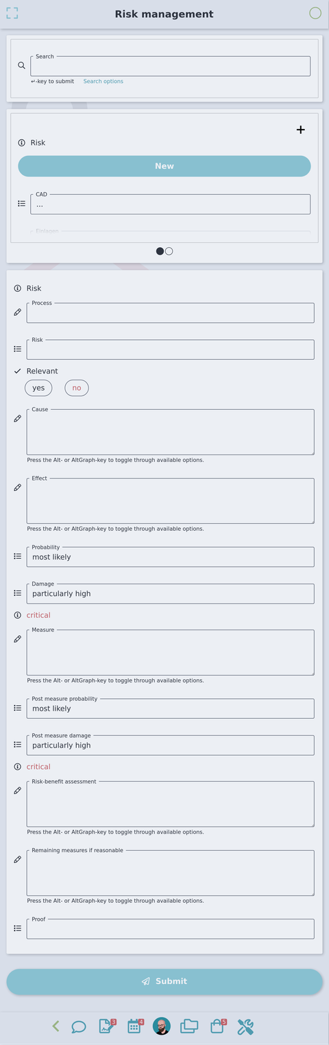 This software aims to support you with your ISO 13485 quality management system and support internal communication. It is supposed to run as a web application on a server. Data safety measures are designed to be used in a network environment not accessible from the web. The architecture enables staff to access and append data where other ERP-software may be limited due to licensing.