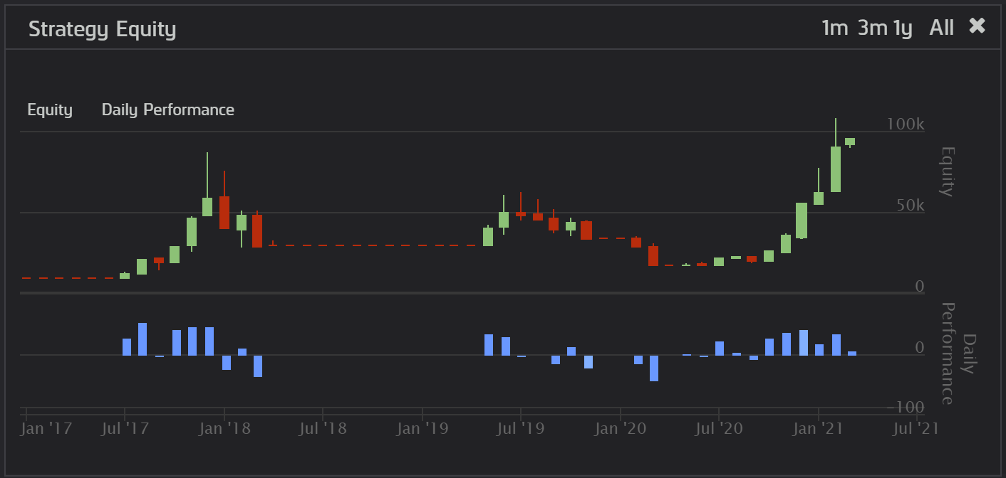 While it does perform extraordinarily well, there are some bugs in the code that still must be fixed and might improve performance. Namely, in some cases, the strategy isn't "quick enough" to use the QuantConnect command "SetHoldings" and therefore it tries to buy bigger quantities than the account has, as the price of the asset seems to fluctuate between getting the price data and issuing the buy order.