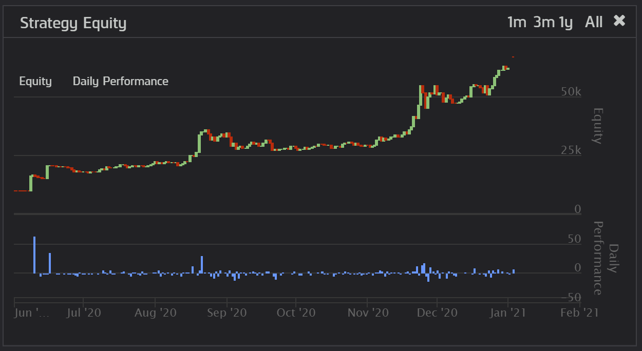 For my initial testing, I took 11 popular cryptos on BitFinex as possible choices. Including all possibilities, unfortunately, breaks the strategy, as we get returns of +33m USD in one week, and then lose all in the next week. As such, the Strategy chooses the top 3 out of the 11 most popular Crypto-USD Pairings on BitFinex. It does outperform buying and holding bitcoin for the same time period.