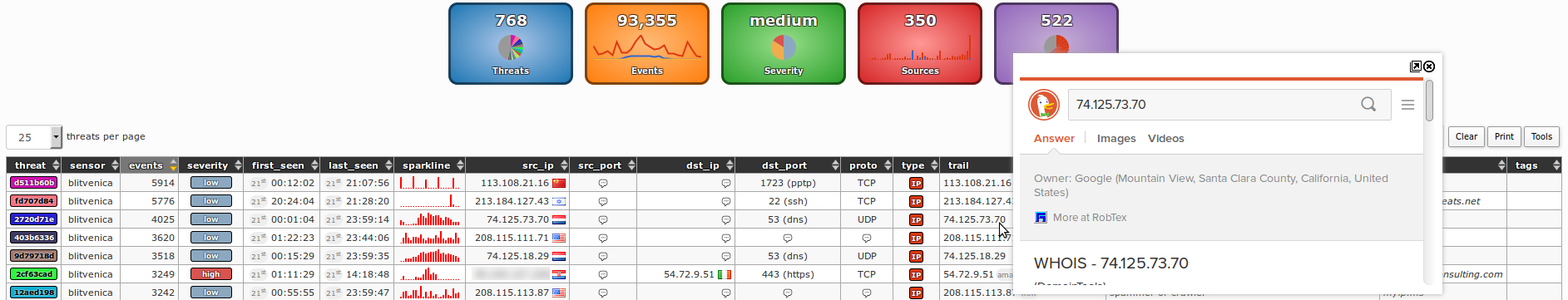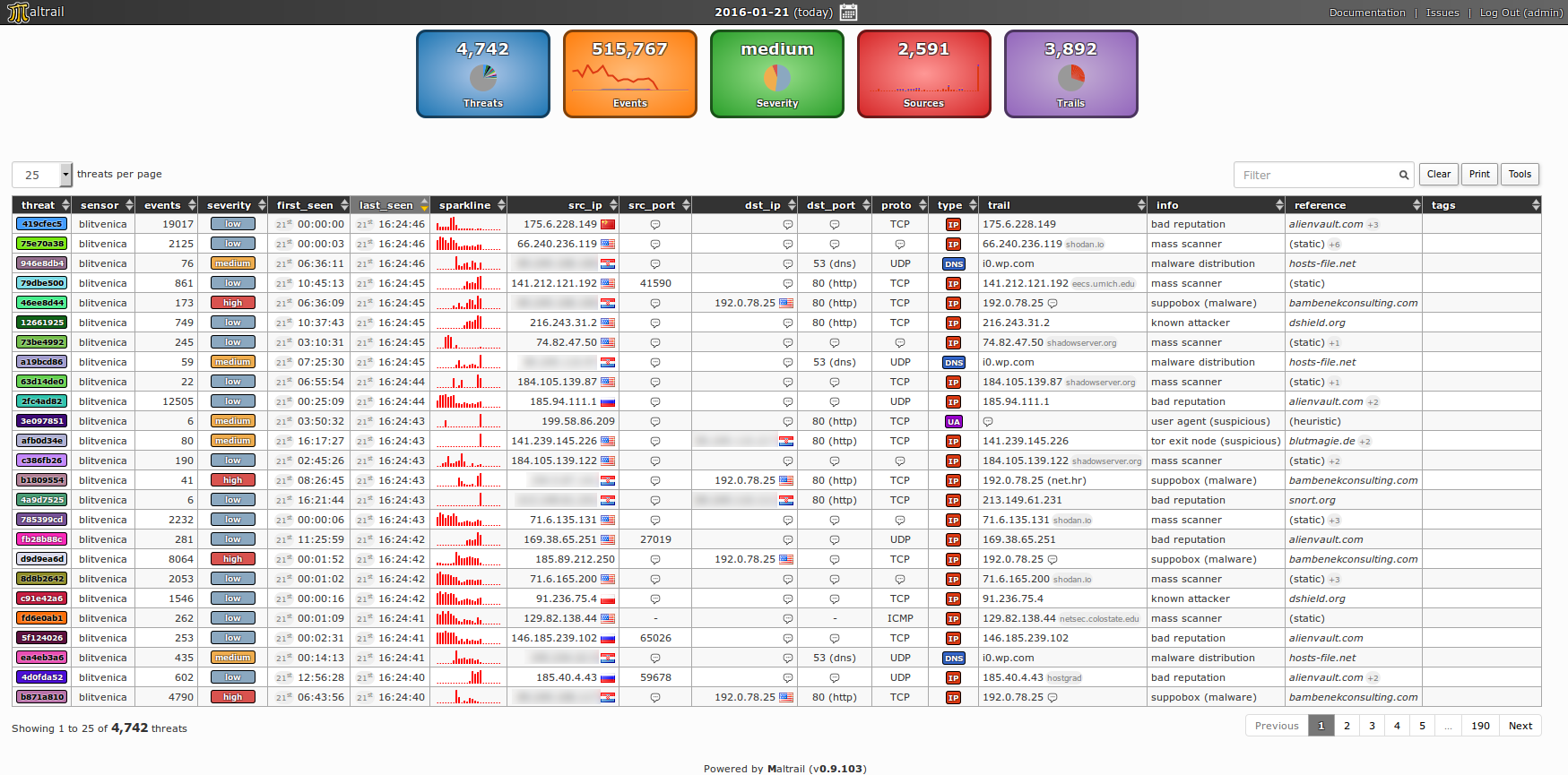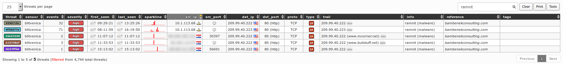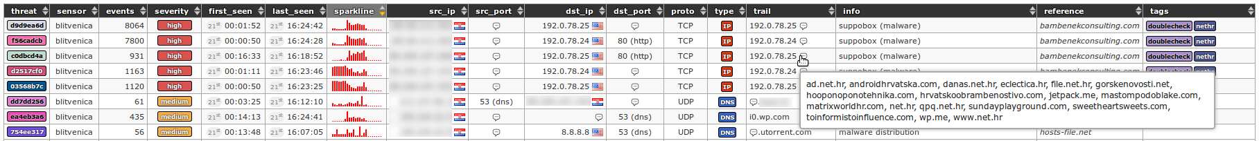 Column threat holds threat's unique ID (e.g. 85fdb08d) and color (Note: extruded from the threat's ID), sensor holds sensor name(s) where the event has been triggered (e.g. blitvenica), events holds total number of events for a current threat, severity holds evaluated severity of threat (Note: calculated based on values in info and reference columns, prioritizing malware generated traffic), first_seen holds time of first event in a selected (24h) period (e.g. 06th 08:21:54), last_seen holds time of last event in a selected (24h) period (e.g. 06th 15:21:23), sparkline holds a small sparkline graph representing threat's activity in selected period, src_ip holds source IP(s) of a threat (e.g. 99.102.41.102), src_port holds source port(s) (e.g. 44556, 44589, 44601), dst_ip holds destination IP(s) (e.g. 213.202.100.28), dst_port holds destination port(s) (e.g. 80 (HTTP)), proto holds protocol(s), (e.g. TCP), trail holds a blacklisted (or heuristic) entry that triggered the event(s), info holds more information about the threat/trail (e.g. known attacker for known attacker's IP addresses or ipinfo for known IP information service commonly used by malware during a startup), reference holds a source of the blacklisted entry (e.g. (static) for static trails or myip.ms for a dynamic feed retrieved from that same source) and tags holds user defined tags for a given trail (e.g. APT28).