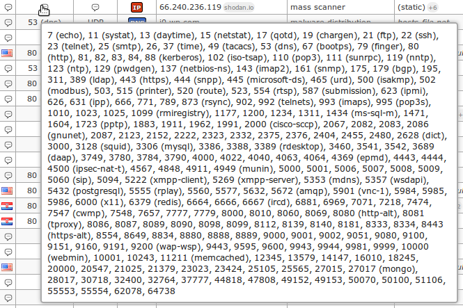 ). This is performed to get an usable reporting interface with as less rows as possible. Moving mouse over such icon will result in a display of an information tooltip with all items held (e.g. all port numbers being scanned by attacker):
