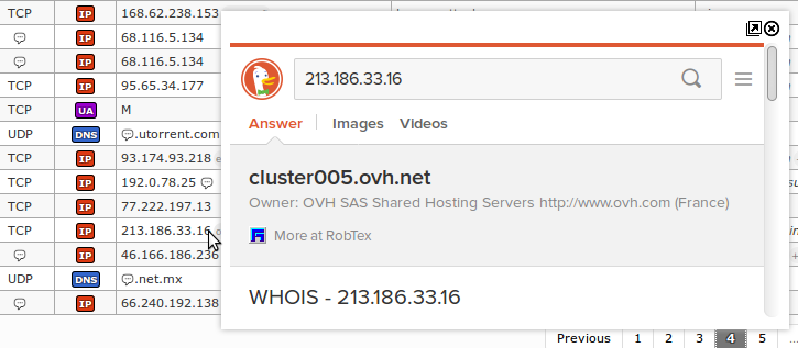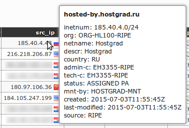 When moving mouse over src_ip and dst_ip table entries, information tooltip is being displayed with detailed reverse DNS and WHOIS information (Note: RIPE is the information provider):