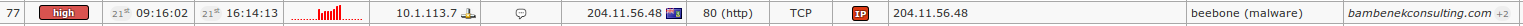 In case of connection attempts coming from infected computers inside our organization toward already known C&C servers, you'll be able to find threats similar to the following (in this case Beebone):