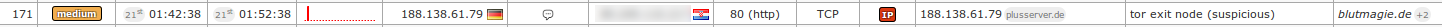 To spot the potential attackers hidden behind the Tor anonymity network, Maltrail utilizes publicly available lists of Tor exit nodes. In the following screenshot you'll see a case where potential attacker has been utilizing the Tor network to access the web target (over HTTP) in our organization's range in suspicious way (total 171 connection requests in 10 minutes):