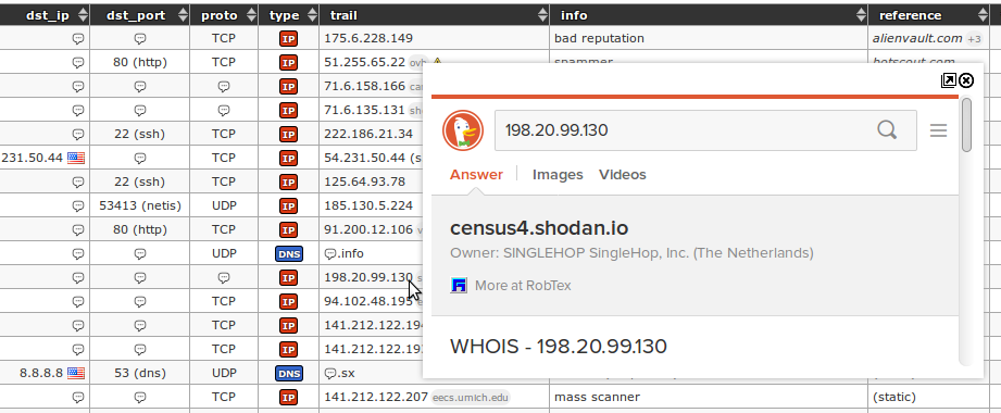 When hovering mouse pointer over the trail column's content (IP address), you'll be presented with the search results from DuckDuckGo where you'll be able to find more information about the "attacker" (i.e. Shodan):