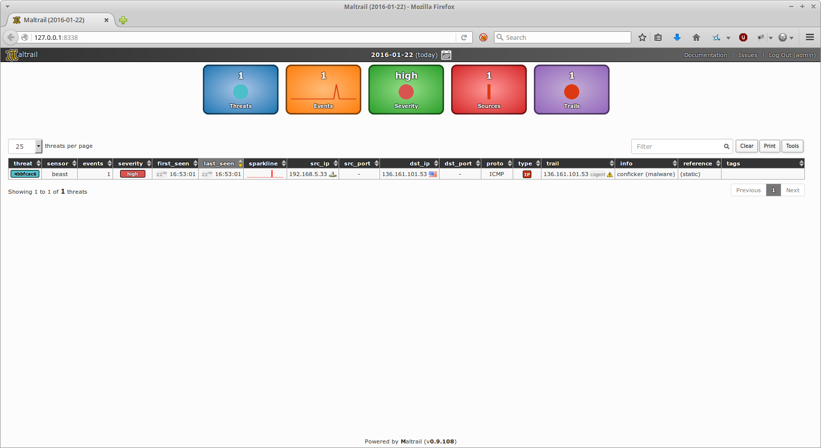 More generally, if we enter the malware into the Filter field, all threats that are known to be triggered by known malware trails (e.g. IP addresses) will be filtered in: