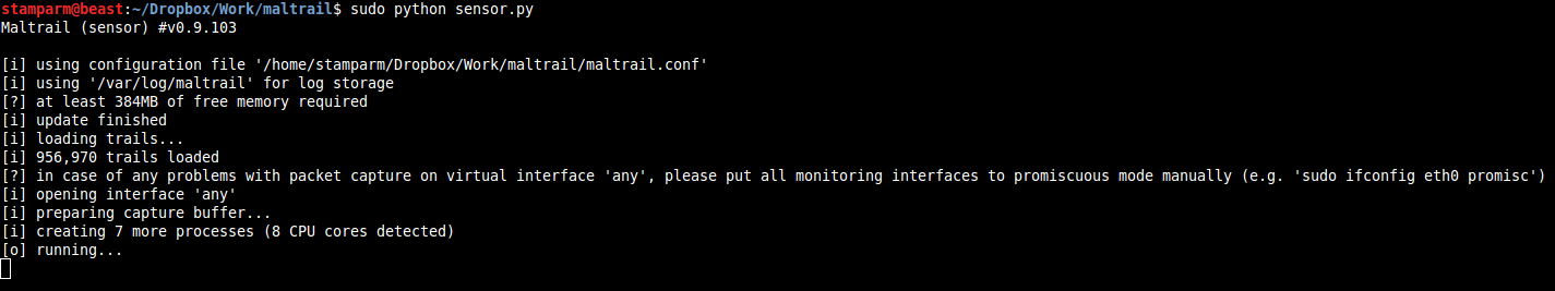 When running the sensor (e.g. sudo python sensor.py) for the first time and/or after a longer period of non-running, it will automatically update the trails from trail definitions (Note: stored inside the trails directory). After the initialization, it will start monitoring the configured interface (option MONITOR_INTERFACE inside the maltrail.conf) and write the events to either the configured log directory (option LOG_DIR inside the maltrail.conf file's section [All]) or send them remotely to the logging/reporting Server (option LOG_SERVER).