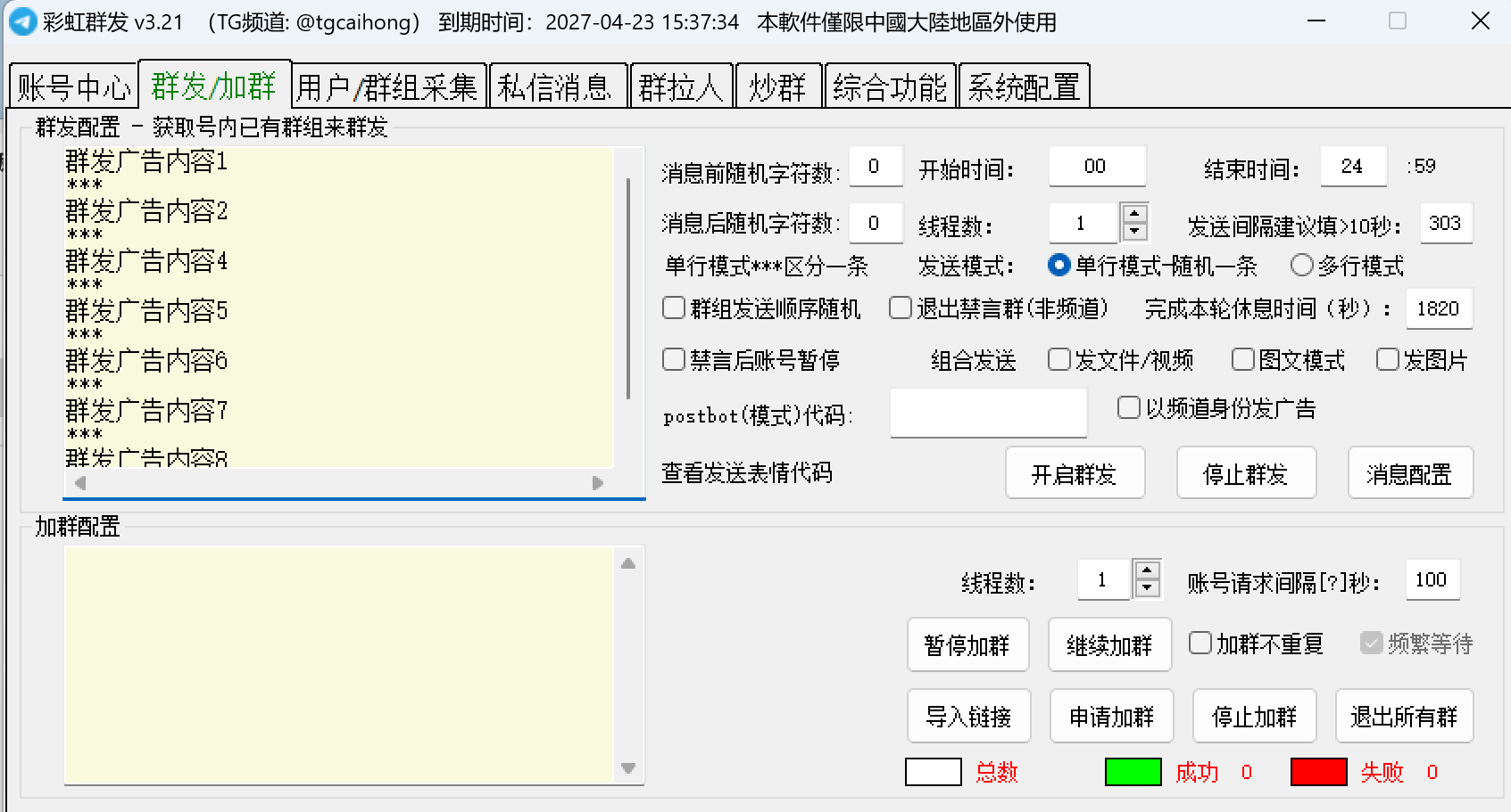 | 🌈 彩虹群发器 | 购买链接 | 多账号管理·一键群发·自动加群·用户采集·智能炒群·适合推广 |