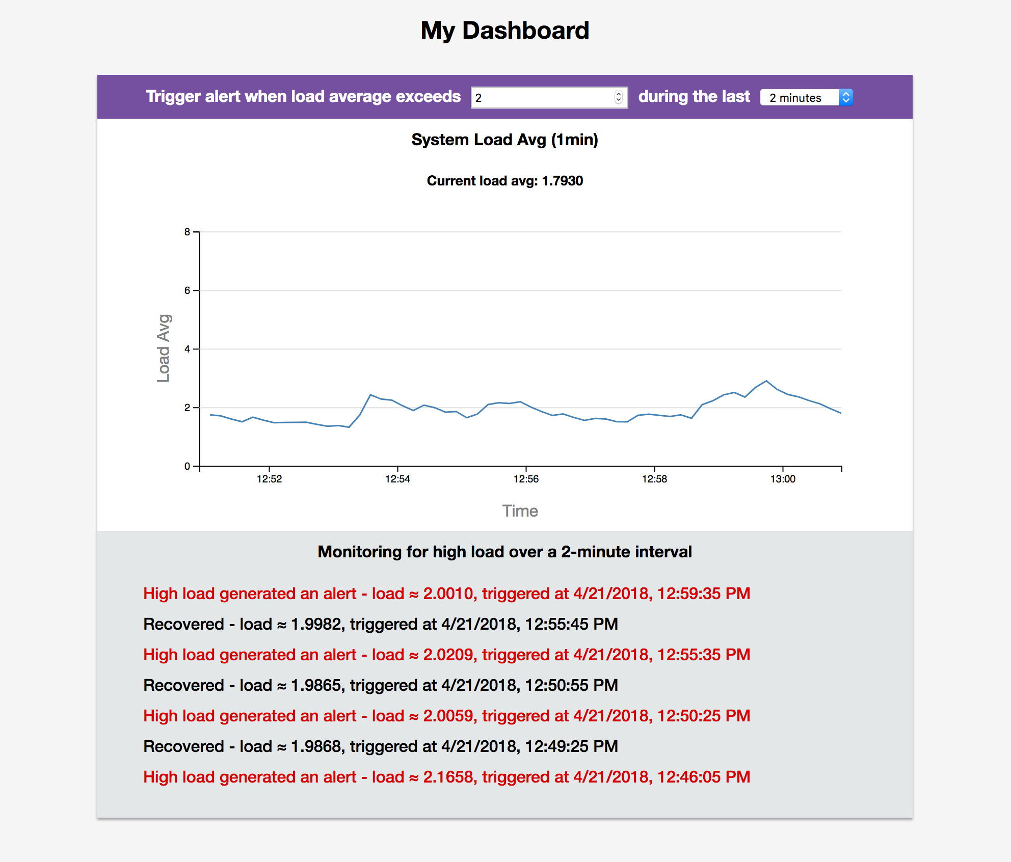 http://127.0.0.1:5000on your browser. - System load average will start plotting to a time series chart in 10 second intervals.