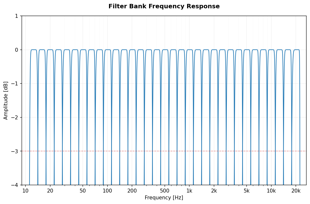 spl, freq = bank.filter(frame, detrend=True)This section provides detailed examples and characteristics for each supported filter architecture.